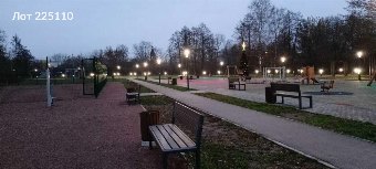 Забор, въездная группа, дорожки, брусчатка, газоны и декоративные насаждения. Голубые и зелёные ели , кедры, сосны , пихты, туи.